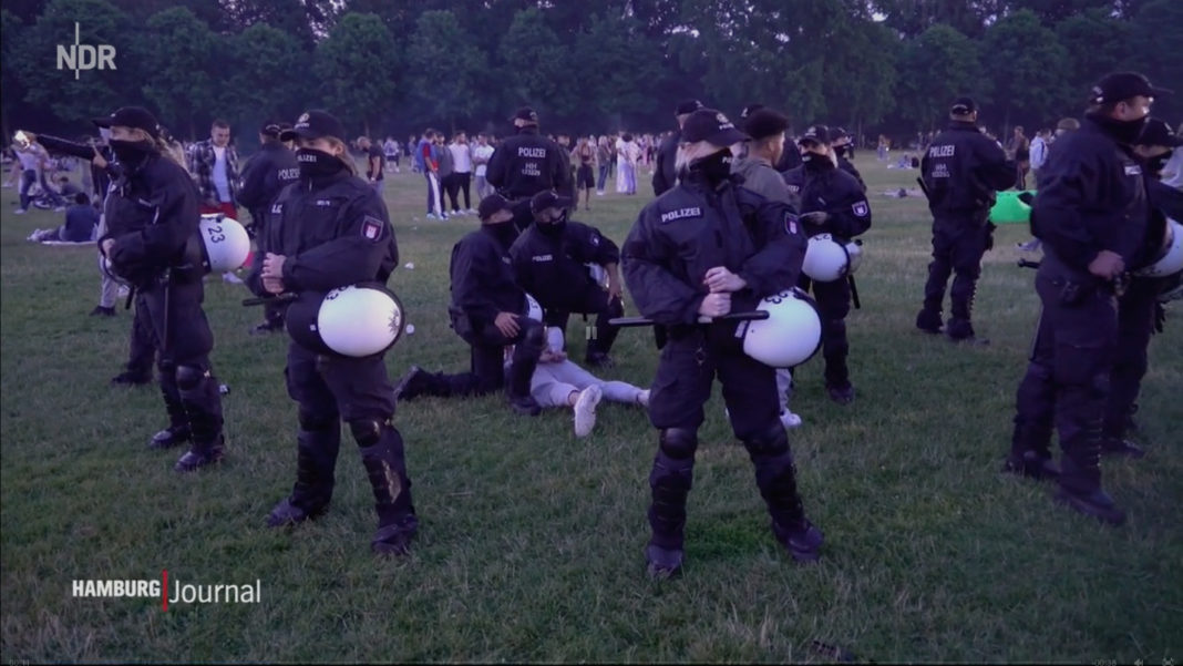 Nachdem die Lage im Hamburger Stadtpark am Sonntag erneut außer Kontrolle geriet, musste die Polizei die große Festwiese zum zweiten Mal am selben Wochenende räumen. Vorerst schien die Lage friedlich und überschaubar. Laut der Polizei, die mit einem Großaufgebot das Treiben beobachtete, um Zustände wie noch am Sonnabend zu vermeiden, hatten sich 2500 Menschen in kleinen Gruppen versammelt und gefeiert.