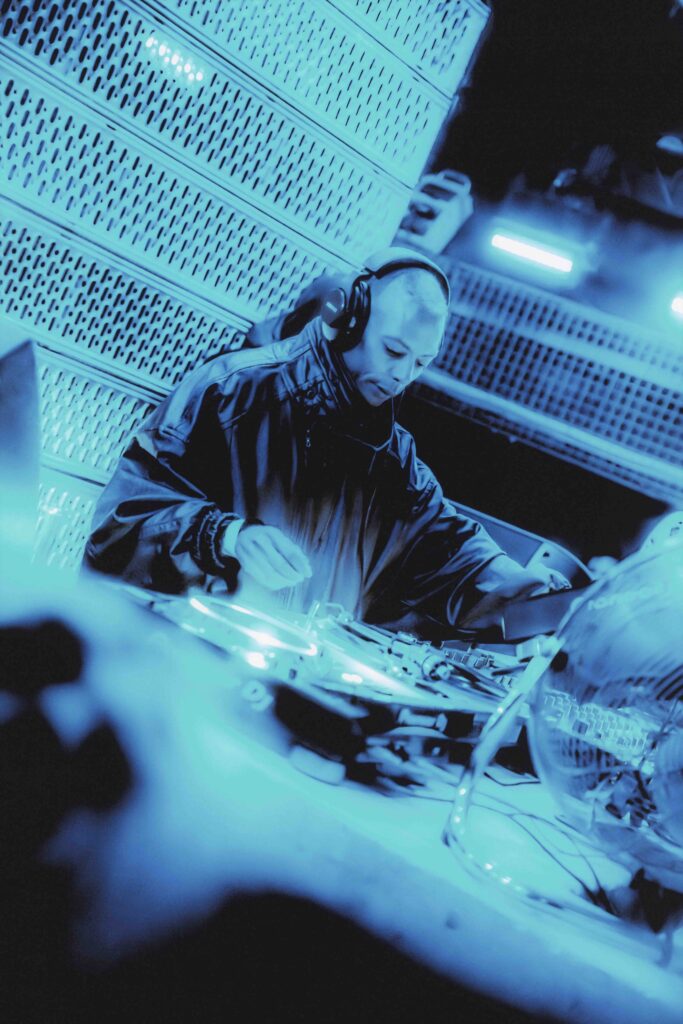 Angekommen, Jacke abgegeben, Getränk in der Hand, machen wir uns auf den Weg zu Jeff Mills. Einmal durch die Menge gewunden, finden wir unseren Platz, und dort steht er: konzentriert, den gesenkten Blick auf die Plattenspieler gerichtet, mit seinen charakteristisch großformatigen Kopfhörern auf den Ohren. Ungefähr eine Stunde spielt er schon, und auch wenn er der erste Act des Abends ist, wird gleich deutlich: Das ist kein Warm-up. Der Bass wummert, die Drums zwingen zur Bewegung.