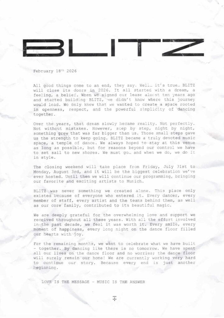 Der Club sei aus „einem Traum, einem Gefühl und einem Glauben” entstanden, mit der Idee, einen Ort zu schaffen, der auf „Offenheit, Respekt und der kraftvollen Einfachheit des gemeinsamen Tanzens” basiert, heißt es weiter. Über die Jahre sei daraus „etwas gewachsen, das weit größer war als wir selbst”, das BLITZ zu einem „Tempel des Tanzes” geworden. Die verbleibenden Monate wollen die Betreiber:innen nun gemeinsam feiern, „tanzend, als gäbe es kein Morgen”.