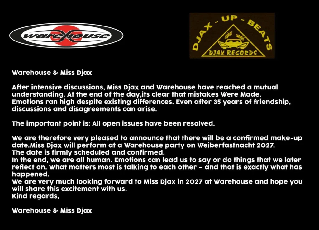 Nach intensiven Gesprächen sind beide Seiten nun zu „einem gemeinsamen Verständnis gelangt”, heißt es in einem gemeinsamen Statement von DJ und Club. Rückblickend sei „klar, dass Fehler gemacht wurden” und die Emotionen zeitweise hochgekocht seien, denn selbst nach „35 Jahren Freundschaft” könnten Meinungsverschiedenheiten entstehen.